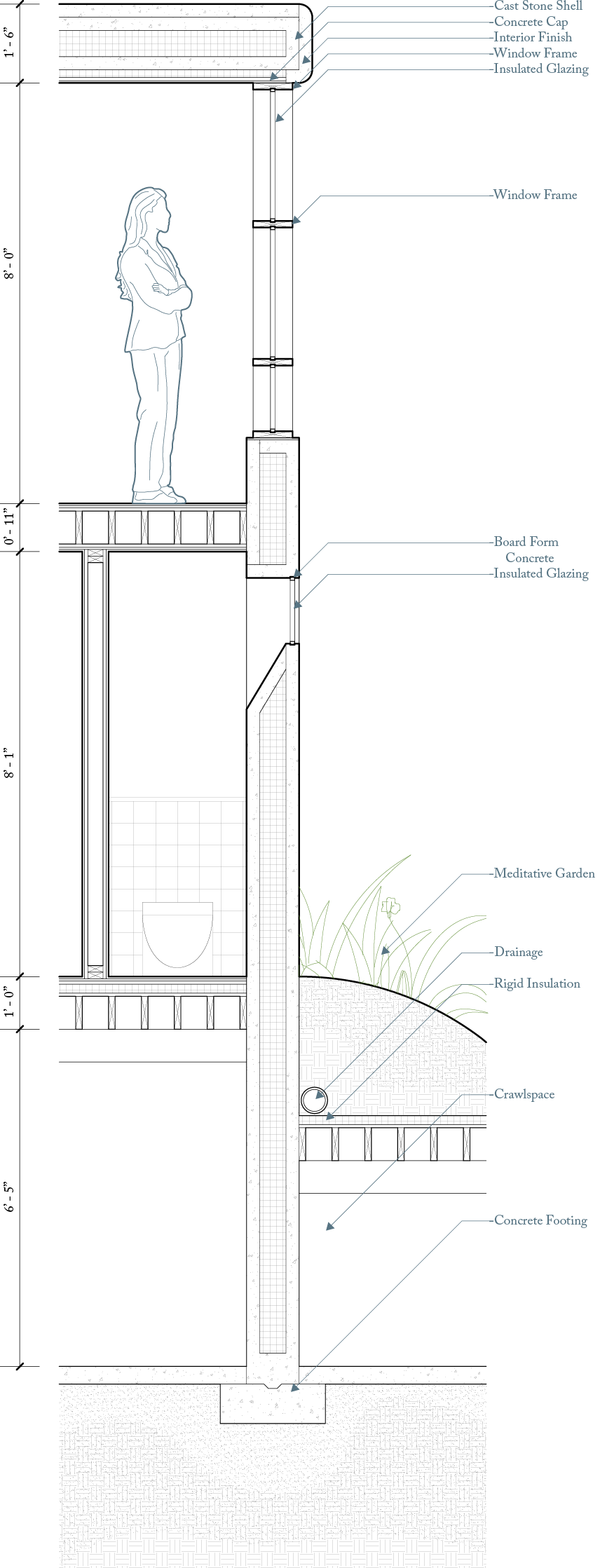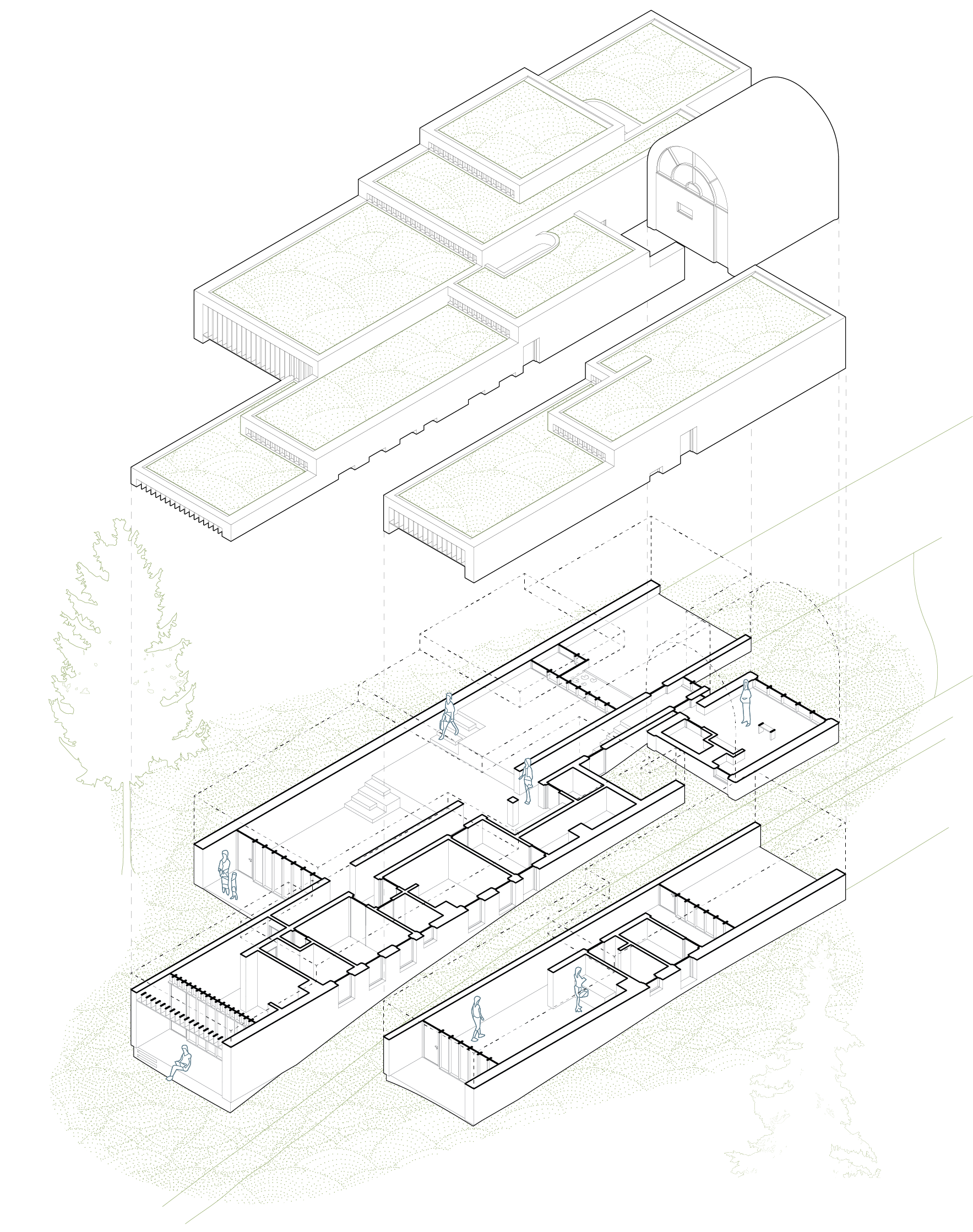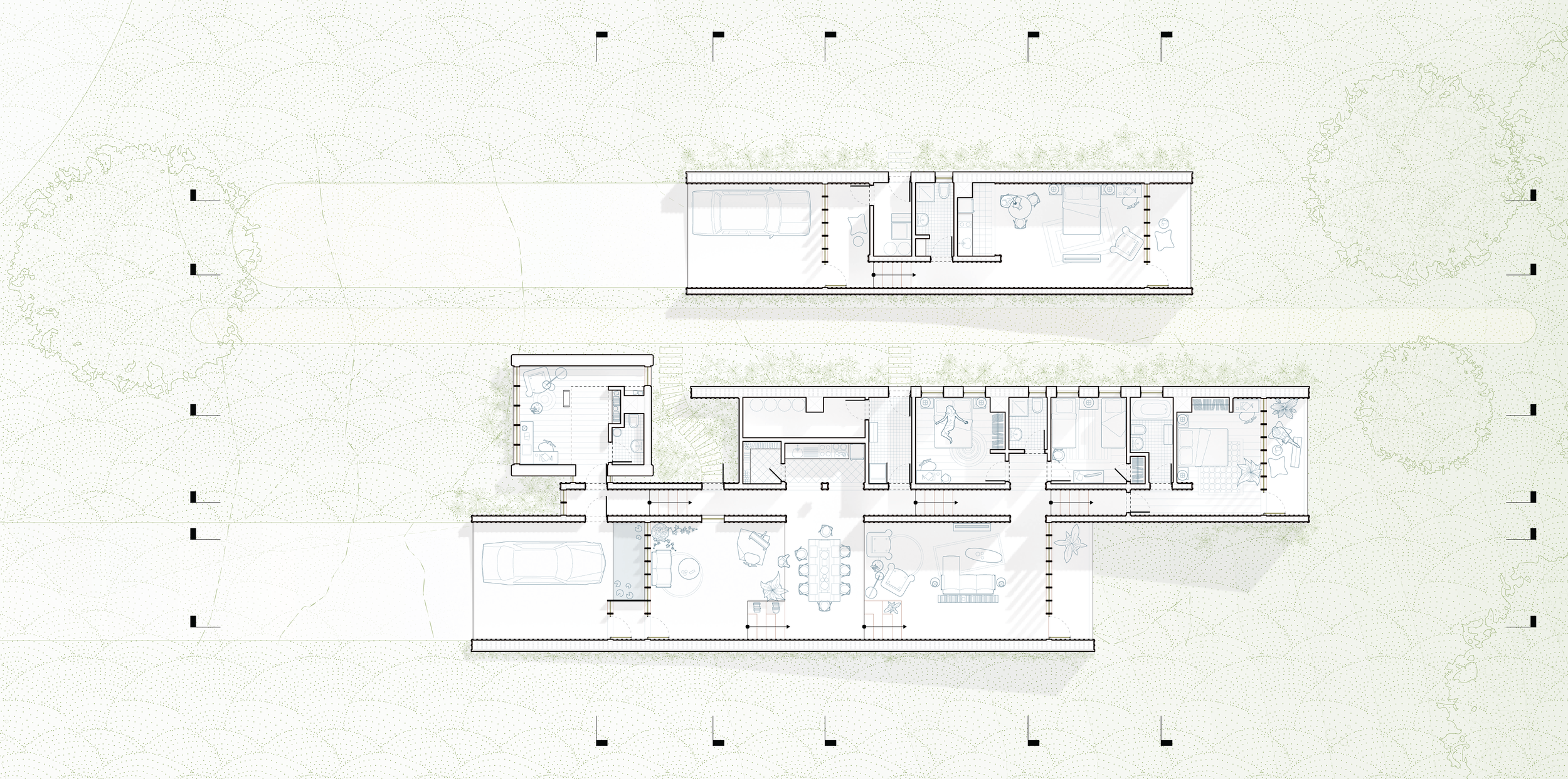 The House Over Echo Bay responds primarily to the topography of the hill, stepping its various volumes down and hugging the landscape. The complex is divided into four volumes; three of these are clad in wood and contain the main living area, the bedrooms, bathrooms, and kitchen, and the guest house; the fourth volume is expressed in concrete, breaking the material and formal language of the others and containing the studio. There is a play between the planes of the roof and the planes of the floor, with offsets that create more open and lively, or more constrained and quiet spaces. The orientation of the spaces aligns with the East/West axis, offering prime views of the sunset and sunrise, while blocking the harsher direct daytime light. The breaks in the roof plane create clerestory windows that bring natural light into the inner spaces. The planted roof replaces much of the permeable ground the house displaced and provides a thermal cap to regulate interior temperatures.