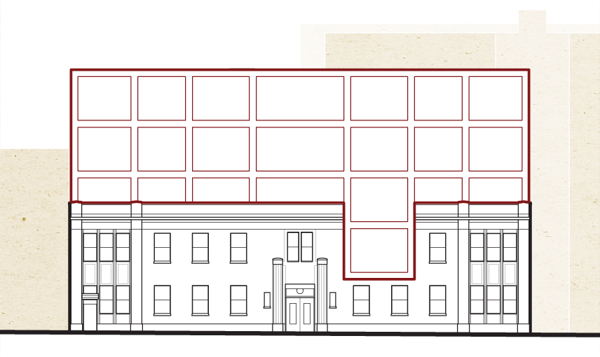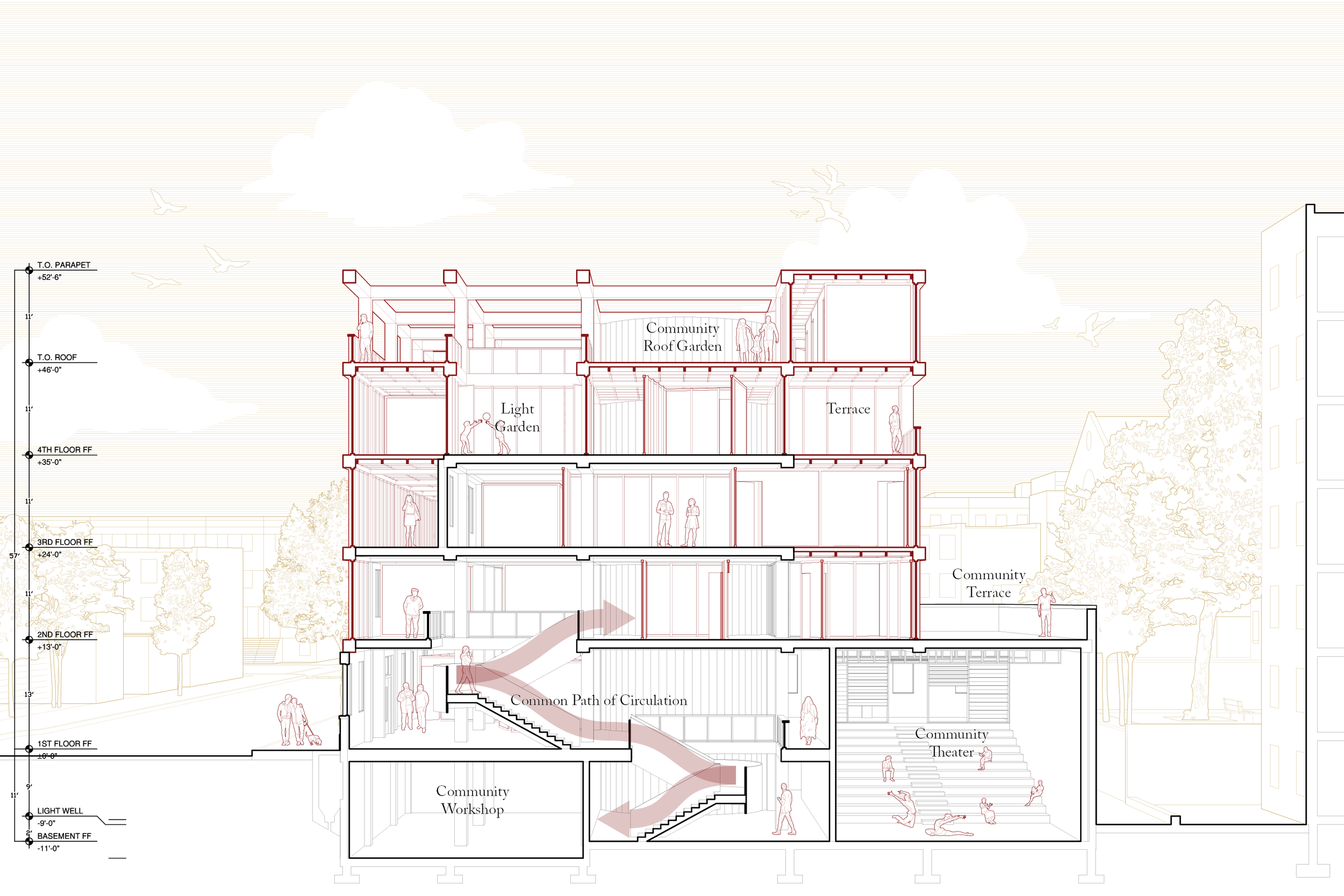 The Lincoln Recovery Center was a thriving cultural center in the South Bronx neighborhood of Mott Haven, hosting maternity clinics and a detox center as well as a rich history of activism and civil protest. This project began as an academic design studio, which I was later commissioned with my professor to develop into a feasibility study for the community lant trust, South Bronx Unite. The significance of the existing building as symbol to the surrounding community led us to preserve its street and park facing facades and build out the zoning envelope to maximize flexibility and minimize cost. The existing building areas were to host the permanent programmatic spaces, such as a theater, a kitchen, and several workshops, while the additional floors were to be used for flexible work and educational areas. The proposal also features a modular kit-of-parts to create temporary subdivisions of the space as the needs of the users changed. The process heavily involved community engagement activities and presentations along with a formal proposal summarizing our investigations and design concept.