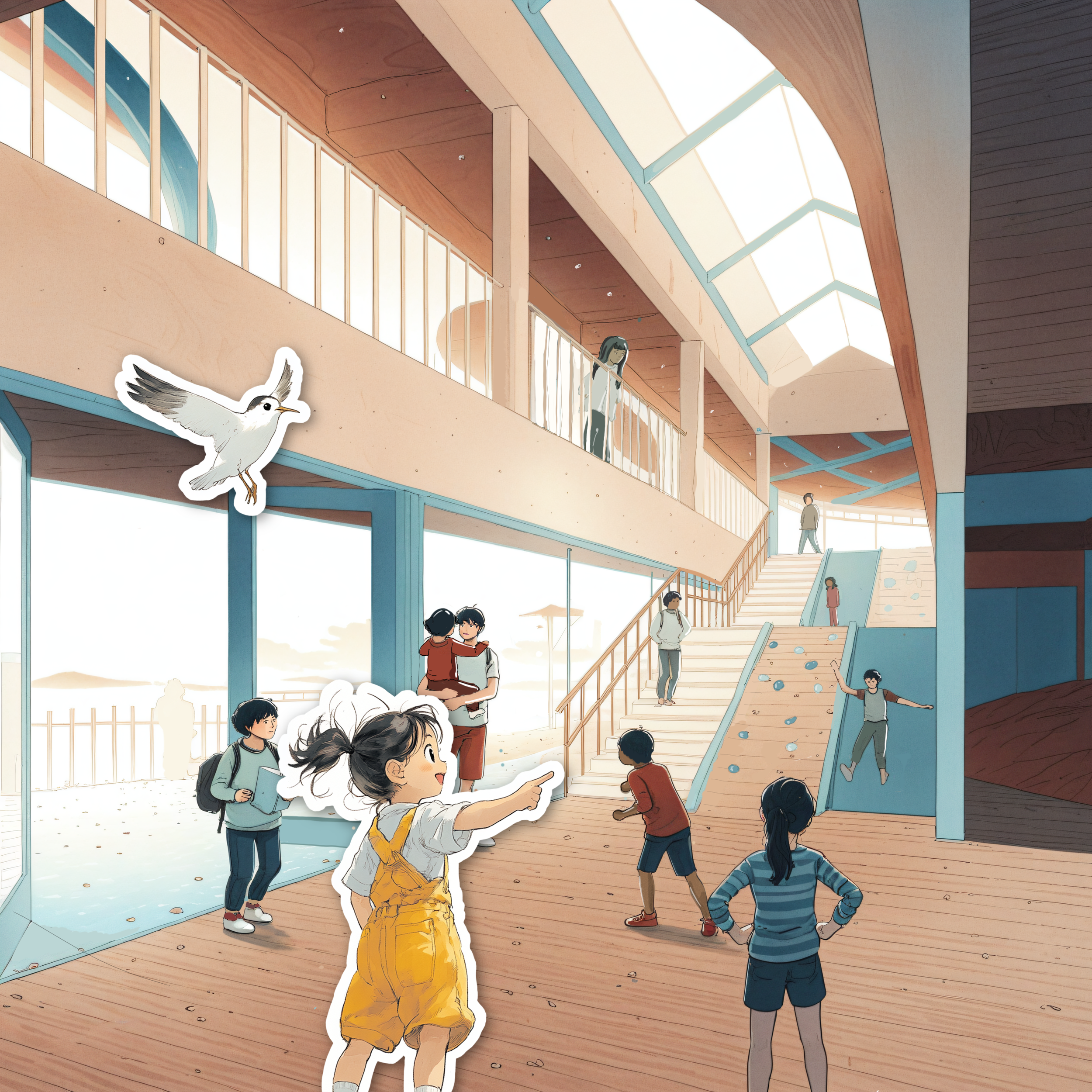 The southern entrance provides access for pedestrians, cyclists, and those arriving by public transportation. An exterior accessible ramp welcomes students, parents, and teachers into the building. Inside, the lobby is a spacious double-height area, housing the security and welcome desk. A central staircase on the left not only connects floors vertically but also serves as a playful feature, incorporating slides and climbing walls. A large skylight floods the lobby with natural light, creating a bright and inviting atmosphere. The accessible ramp extends into the interior, connecting the lower entrance level to key spaces such as the auditorium (a multifunctional space), administrative offices, staff facilities, a first aid room, and classrooms. This ramp also raises the building to address weather-related risks while optimizing waterfront views. Adjacent to the ramp, a secure and private interior courtyard serves as the heart of the school, offering children a space to play, discover, and explore.