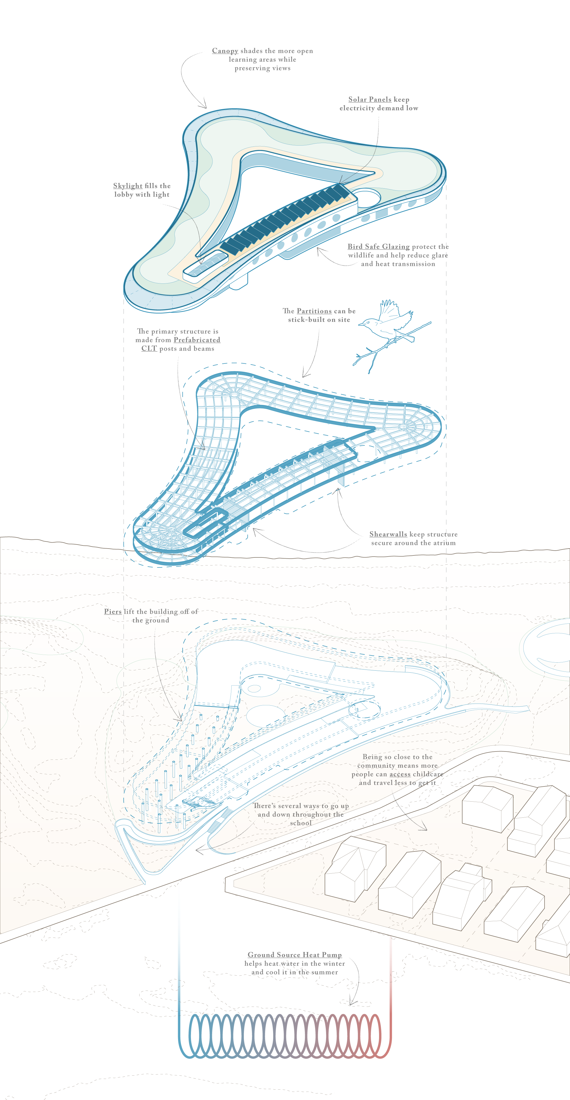 The interior ramp continues throughout the building, eventually transforming into an exterior rooftop ramp. The roof features dedicated play areas, protected green zones that support bird habitats, and solar panels, blending sustainability and functionality into the design..